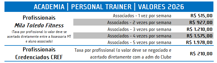 - Valor de aula particular: deve ser acertado diretamente entre o Personal e o aluno.